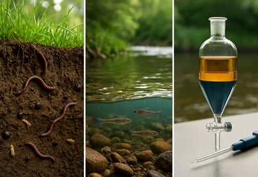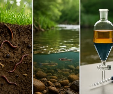Estudios de degradación en matrices ambientales (suelo, agua, sedimento) según OECD 107-108.